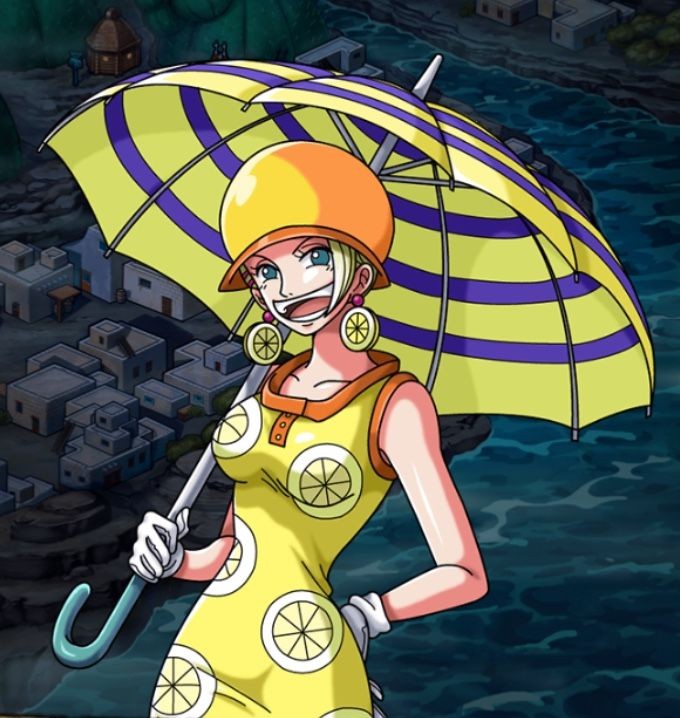 Legenda:O Kiro Kiro no Mi é uma fruta do diabo do tipo Paramecia que permite ao usuário mudar seu peso de 1kg para 10.000 kg sem, de forma alguma, afetar o tamanho total de seus corpos. Ela usa esse poder para esmagar seus oponentes, ou deixá-la leve o suficiente para deslizar através do ar usando seu guarda-chuva, (necessário ativo para usar suas habilidades). Pode ser usar 1x